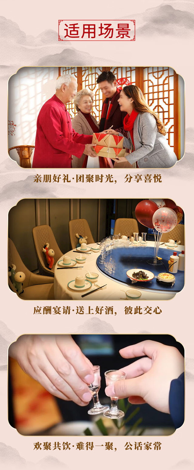 使用場(chǎng)景:商務(wù)接待、宴請(qǐng)、聚會(huì)、自飲、收藏,金紅搭配外觀寓意繁榮與喜慶