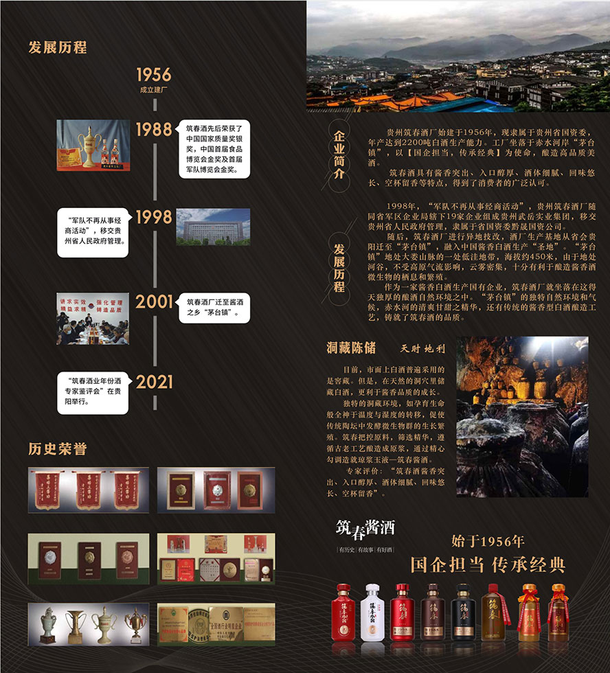 貴州筑春酒廠始建于1956年,現隸屬于貴州省國資委,年產達到2200噸白酒生產能力。工廠坐落于赤水河岸“茅臺鎮”,以【國企擔當,傳承經典】為使命,釀造高品質美酒。