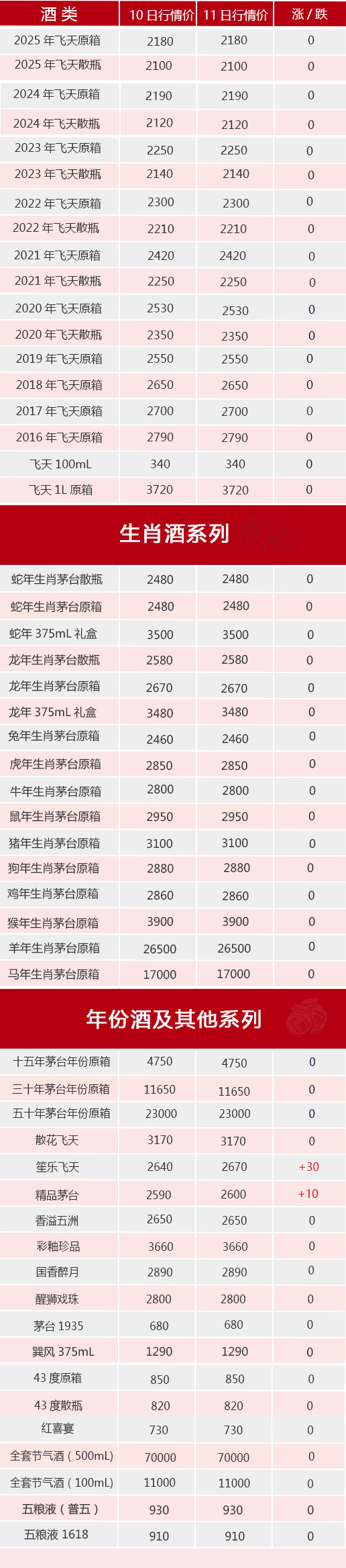 今日茅臺酒行情價:飛天系列和生肖系列無變動;其他系列,精品茅臺漲10元/瓶,笙樂飛天漲30元/瓶。