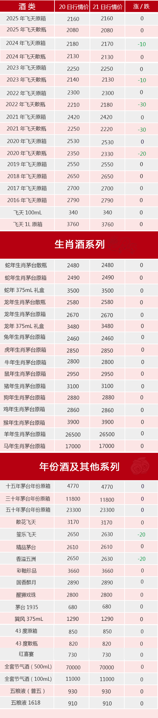 今日茅臺酒行情價:飛天系列,2024年原箱跌10元/瓶,2020~2023年散瓶跌10~30元/瓶;生肖系列無變動;其他系列,笙樂飛天和香溢五洲跌20元/瓶。