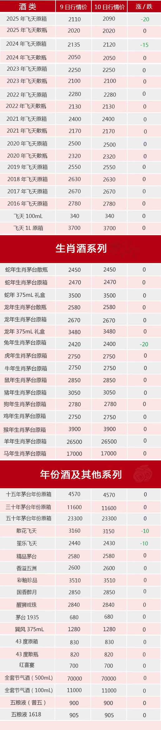 今日茅臺酒行情價:飛天系列,2025年原箱和散瓶跌15~20元/瓶;生肖系列,兔年原箱跌20元/瓶;其他系列,散花飛天和笙樂飛天跌10元/瓶。
