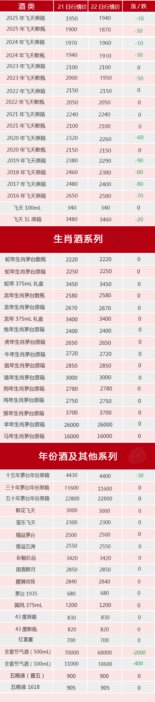 今日茅臺酒行情價:飛天系列,2024~2025年原箱和散瓶、飛天1L原箱跌10~30元/瓶,2016~2020年原箱和2023年散瓶跌50~90元/瓶;生肖系列無變動;其他系列,十五年跌30元/瓶,全套大小節氣酒分別下跌2000和400元/瓶。