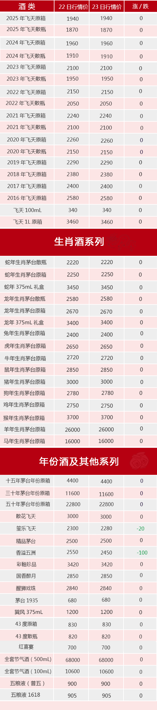 今日茅臺酒行情價:飛天系列和生肖系列無變動;其他系列,笙樂飛天跌20元/瓶,香溢五洲跌100元/瓶。