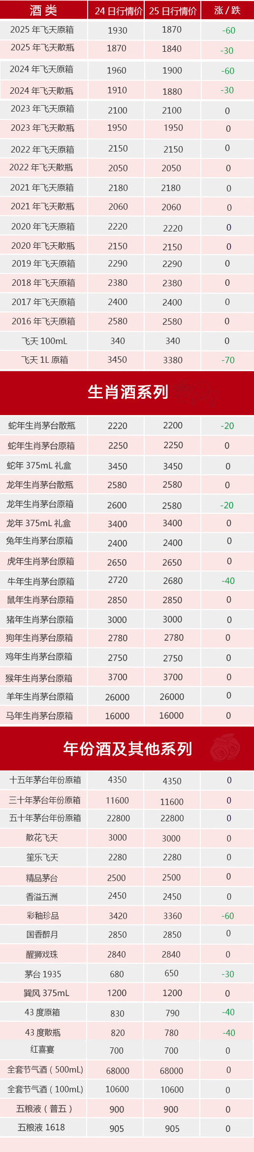 今日茅臺酒行情價:飛天系列,2024~2025年原箱和散瓶跌30~60元/瓶,飛天1L原箱跌70元/瓶;生肖系列,蛇年散瓶、龍年原箱以及牛年原箱跌20~40元/瓶;其他系列,茅臺1935、43度原箱和散瓶跌30~40元/瓶,彩釉珍品跌60元/瓶。